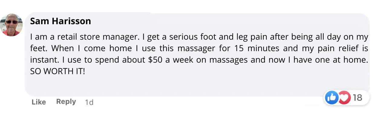 I suffer from plantar fasciitis really, really bad at times. This massager is really helpful. The relief My pain is completely gone. I don't have to take as much medicine for pain! Thank you oh-so much!